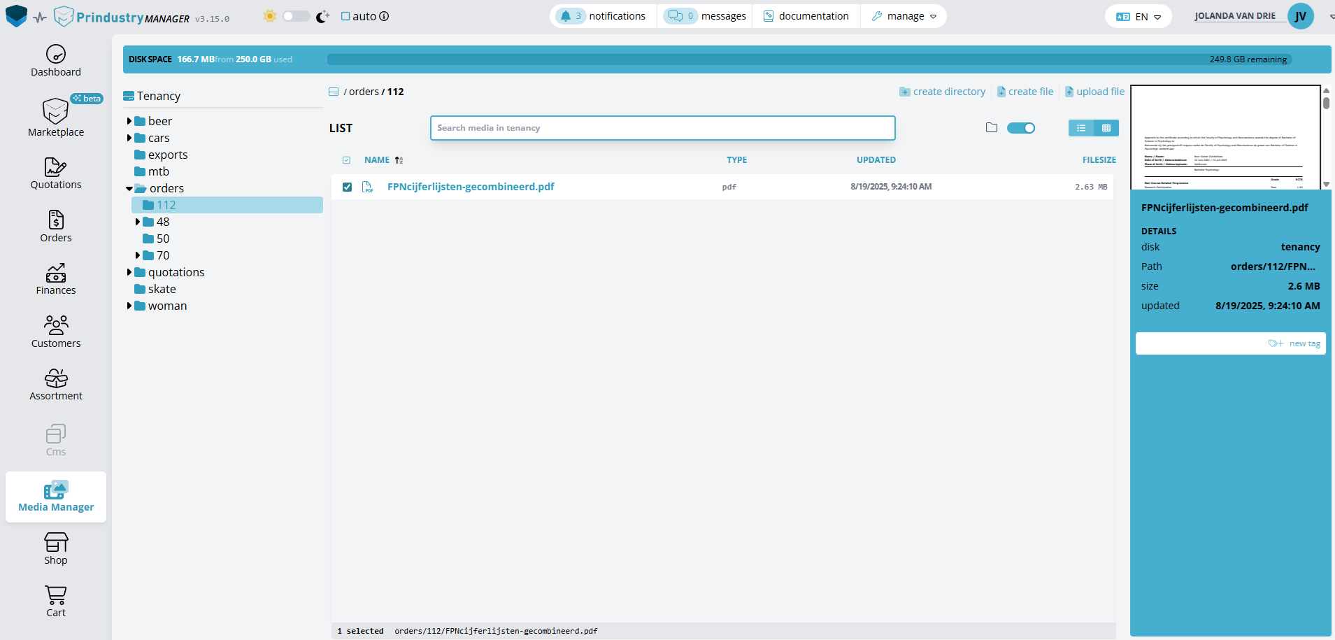 The Prindustry Platform includes a built-in Media Manager – a central hub for all your files and assets. Perfect for everything related to your orders, from product images to marketing materials. Easily attach files to orders or your webshop. The Media Manager uses smart tags and is linked to user roles and permissions. That means: quick access to what you need and full control over who can do what.