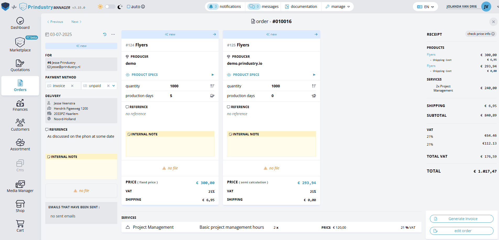As a print manager or reseller, you are the vital link between customer and production. To ensure speed and efficiency, you need smart tools. The Prindustry Platform brings the entire order process together in one central system. With advanced automation, you can issue quotes fast, compare your in-house pricing with external rates, automate purchasing across multiple suppliers, and easily evaluate print options.
